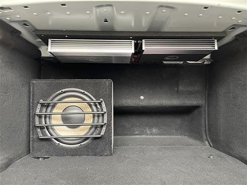 為了不影響奔馳S320尾箱的使用,我們的改裝師還將兩臺功放并排式懸掛固定安裝在尾箱上方,同時做好線路的整理,隱藏,絲毫不影響美觀度,可謂是用心之至。再添加一只勁浪亞麻十寸低音,使聲音渾厚飽滿,有彈性,將音樂細節(jié)淋漓盡致的展現(xiàn)!