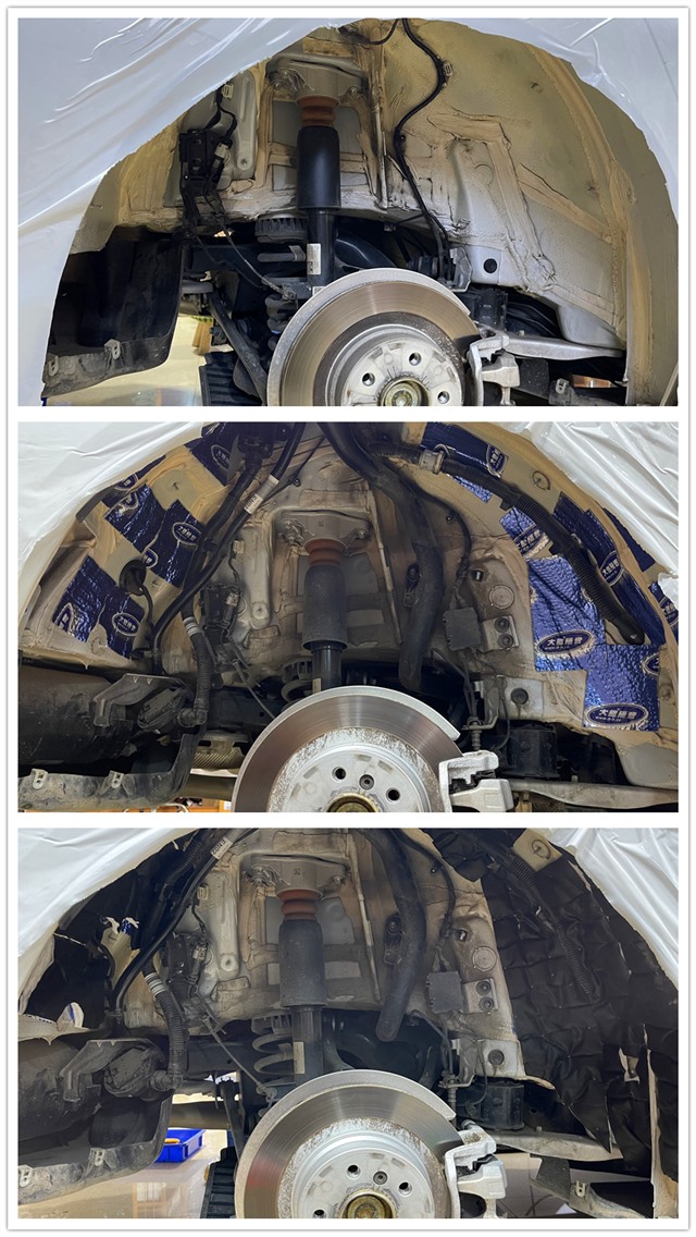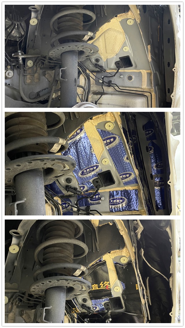 先對前輪弧進行專業隔音處理,阻隔胎噪的傳遞