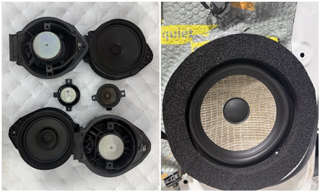 施工前,師傅對車內(nèi)飾進行了全面保護,避免在操作過程中劃傷或污染內(nèi)飾部件。并且把原車喇叭拆卸下來,可以看到原裝喇叭沒有任何保護措施,其背部已經(jīng)微微泛黃,我們用勁浪中低音單元替換原車門喇叭后在前后聲場的喇叭均加裝防水墊圈,避免水分侵蝕。原車喇叭與勁浪喇叭的對比清晰可見——后者材質(zhì)和工藝明顯更優(yōu)。