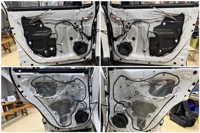 原車(chē)門(mén)板僅有一層薄弱的防水膜,無(wú)法抑制振動(dòng)和噪音。我們將其清除后,使用GT隔音材料進(jìn)行了標(biāo)準(zhǔn)的三層隔音處理,完成第二層隔音時(shí),我們還將勁浪喇叭在前后門(mén)板進(jìn)行了原位無(wú)損安裝,還加裝了美音圈,使聲音集中起來(lái)。