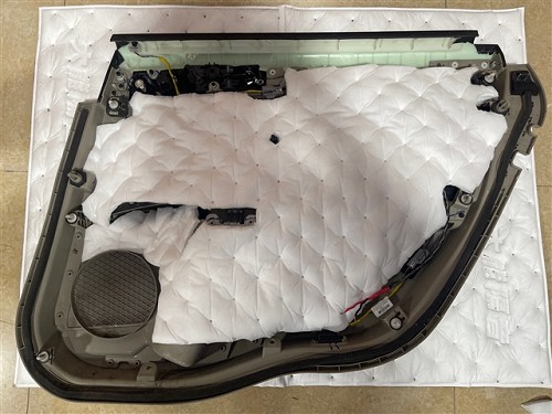 將門板飾蓋拆下來就可以看到原車門板是只有一層防水膜,沒有任何隔音效果!