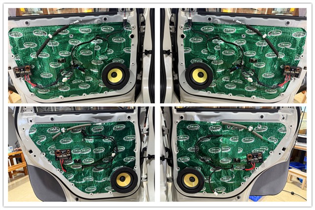 為了給喇叭創造一個更加安靜、干凈的聽音環境,改裝師使用大能超級盾對四門和尾箱區域進行了專業隔音處理。大幅削減車內共振和噪音干擾,提升整體車廂靜謐性。在與車主充分溝通后,前后聲場選用法國勁浪ES 165 KE兩分頻,中低音原位安裝在前后門板,搭配隔音處理,有效提升中頻飽滿度和低頻的下潛力度;高音分別安裝在前門三角位和后門板上。