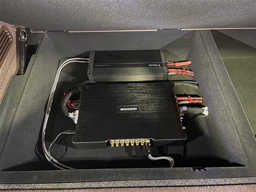 歌航R316 DSP功放與勁浪FPX 1.1000單路功放接線隱藏安裝在尾箱凹槽處