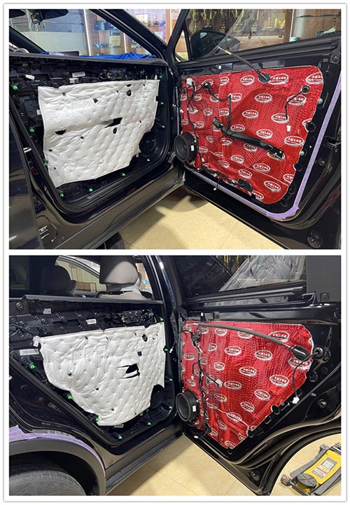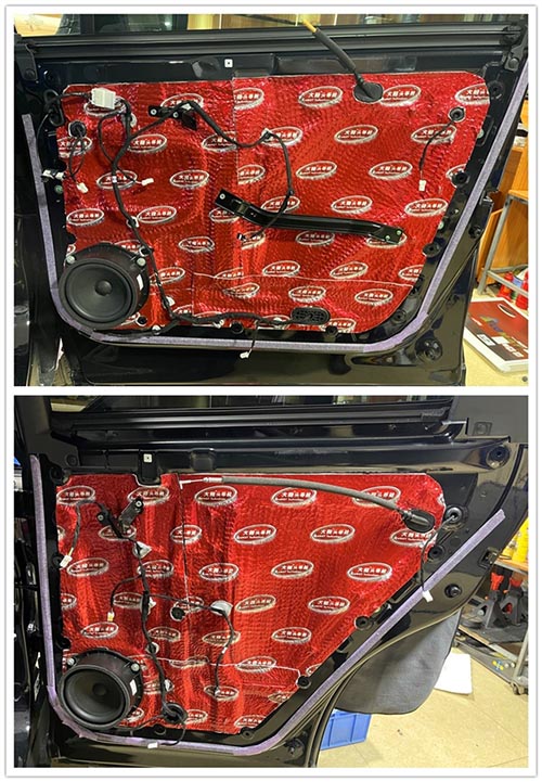 隔音改裝的關鍵在于選擇合適的隔音材料。在此次改裝中,改裝師選擇了大能隔音品牌對四門進行隔音處理。第一層采用大能紅派,具有優異的減震、隔熱、防銹以及鈑金強化性能,第二層施工則進一步提升了隔音效果,第三層配備了超級溫莎棉,有效吸收共鳴噪音,阻隔熱能,同時降低能耗。