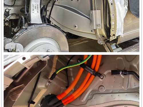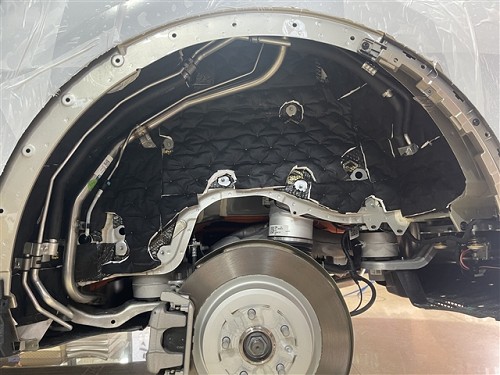 改裝師首先對噪聲來源進行了詳細檢查。通過這種有針對性的檢查,可以準確找到噪聲的主要來源,避免盲目施工,既節省成本又能達到最佳效果。前后輪弧及葉子板是胎噪、路噪最常傳入的地方。行駛時,避震器所傳導的異音,以及輪胎與路面及碎石與鈑金之間的撞擊雜音,都是噪聲的主要來源。為此我們拆下內襯板針對四輪進行隔音。