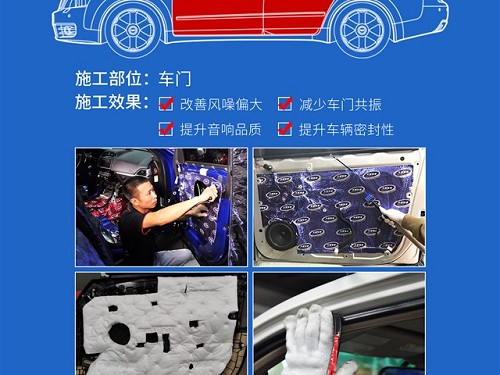 第四步,門板外層鐵皮同樣要施工一層大能藍金剛止振板,封閉門板使之成為一個結實有力的箱體,加強車門和車身的密封,有效減低車子高速行駛的風噪音,另外的功能作用是當隨手關門時,可明顯感覺到高檔轎車的壓耳感,同時減輕對車窗升降系統的沖擊。