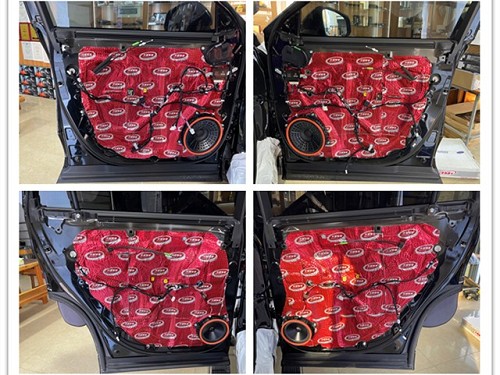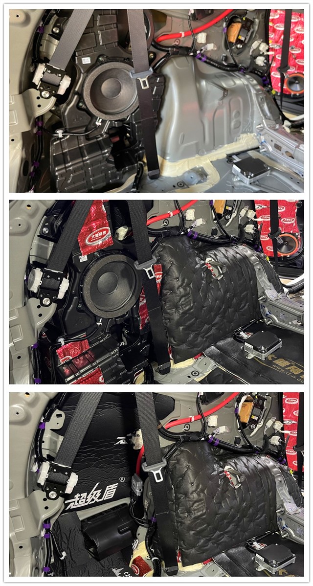 原車門板鐵皮結構拆開飾蓋可以看到,門板的隔音措施較少,而且又有較多的空洞結構,風噪和門板震動的噪音很容易就傳入車內。因此改裝師對門板進行三層隔音處理。汽車門板的隔音處理一方面能夠降低噪聲,而另一方面又能增強鈑金剛性。改裝師先用大能紅派對門板進行雙層隔音處理,主要起的是止振密封的作用,再使用超級溫莎對門板飾蓋進行第三層隔音處理,將車廂打造成一個結實的音箱。