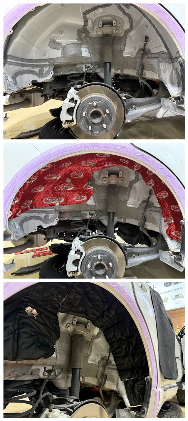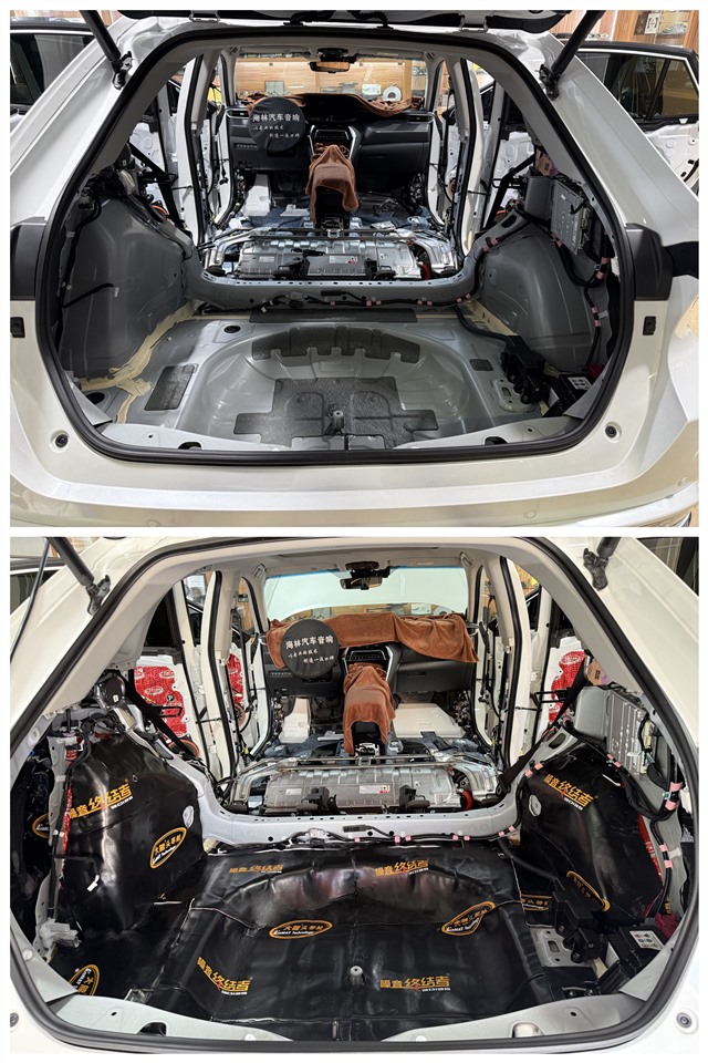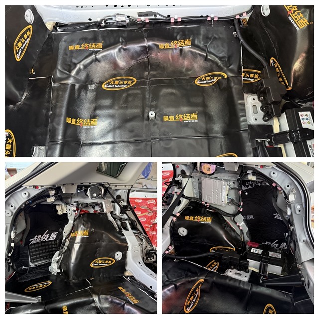 底盤與尾箱是整車噪音傳遞的核心通道,技師將車體相關(guān)部位徹底拆解,露出原生鈑金。對(duì)比施工前后的狀態(tài),原車幾乎無有效隔音措施,而升級(jí)后,底盤與尾箱均鋪設(shè)大能紅派隔音與超級(jí)蕰莎,雙層防護(hù)有效抑制鈑金共振,阻隔路噪與尾排噪音。