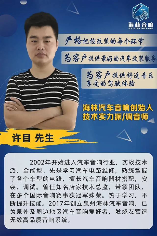 一直以來,泉州海林致力于專業(yè)汽車音響改裝,隔音降噪,創(chuàng)始人許目先生更是從2002年入行汽車音響行業(yè),距今已20多年,在工作中,不斷學(xué)習(xí),鉆研,先是學(xué)習(xí)汽車電路維修,熟練掌握各個(gè)車的車型電路,還擅長汽車音響器材搭配,安裝,調(diào)試等,外地過來調(diào)音的車友好評(píng)如潮。